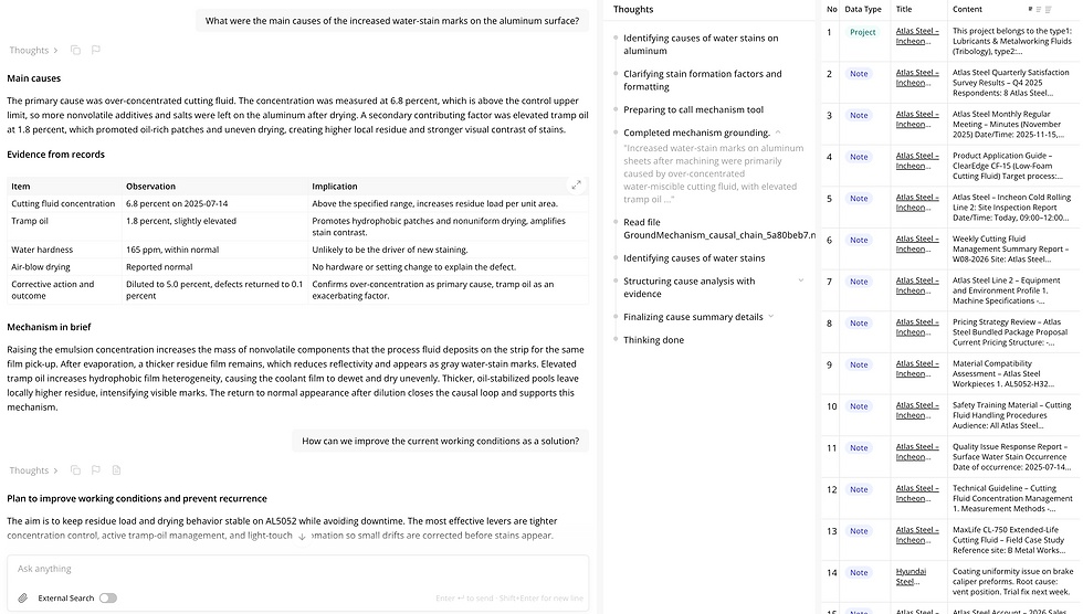 Your engineer asks a question. Assistant doesn't just give an answer. It traces the mechanism step by step, grounded in scientific disciplines including material science, chemical interactions, and environmental factors, each with a confidence rating. It generates ranked root cause hypotheses so your team knows what to test first, not what to guess at.